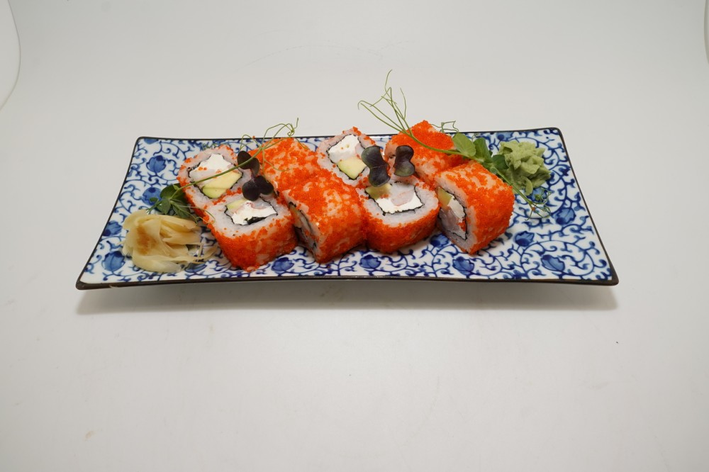 Рис, нори, креветка, тобико, авокадо, сыр творожный