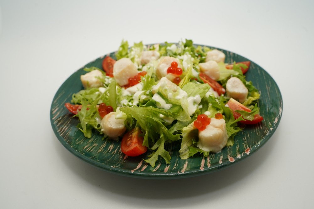 Филе свежего курильского гребешка, микс салат, помидоры черри, икра лососевая, сливки.