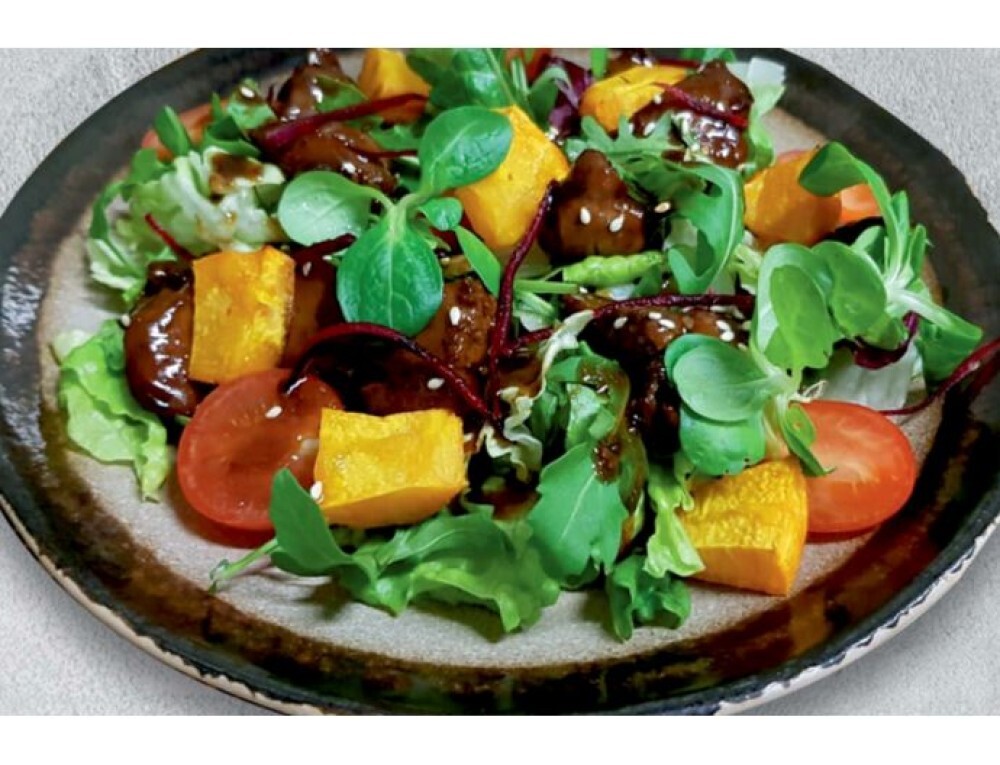 Куриная печень, тыква, черри, микс салата, кунжут, соус "Якинику".