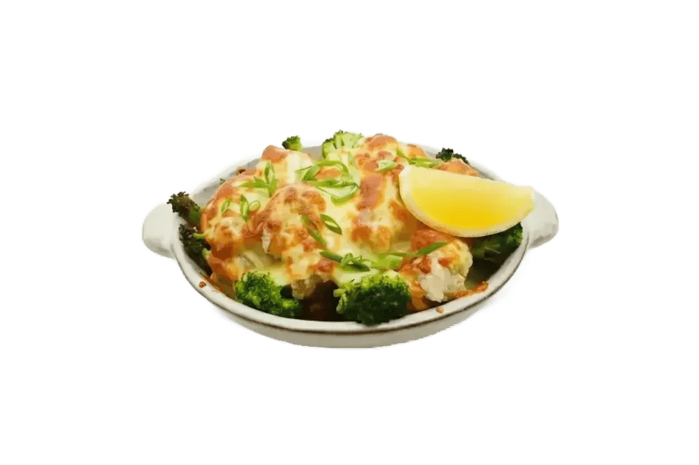 Филе красного окуня, картофель, брокколи, лук репчатый, морковь, грибы, сыр "Моцарелла", соус на основе сливок, молока и пасты мисо.