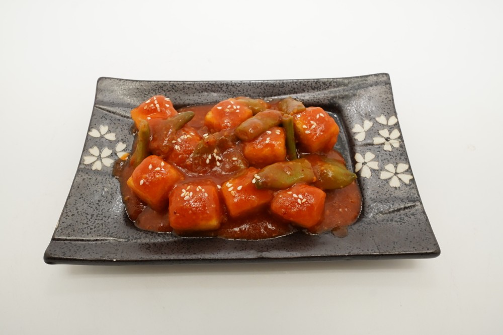 Тофу, фасоль, соус "Чили", кунжут, лук порей.